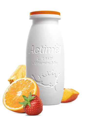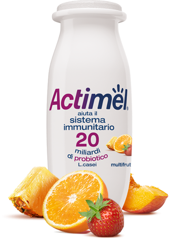 Bevanda a base di latte fermentato con Lactobacillus casei, Streptococcus thermophilus e Lactobacillus bulgaricus, zucchero e preparazione di frutta arricchita con calcio e vitamine B6 e D. Latte scremato, crema di latte, zucchero liquido (saccarosio: 9%), succhi di frutta a base di succhi concentrati 2,1% ananas, pesca, arancia, fragola, destrosio, stabilizzanti: amido modificato di tapioca, pectina; sali minerali del latte, aromi naturali, probiotico: L.casei (Lactobacillus paracasei subsp. paracasei CNCM I-3689), fermenti lattici: S.thermophilus, L.bulgaricus; vitamine B6 e D3. Senza glutine. Senza conservanti e senza coloranti artificiali.