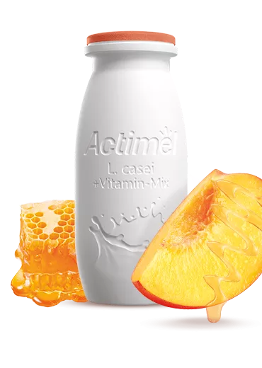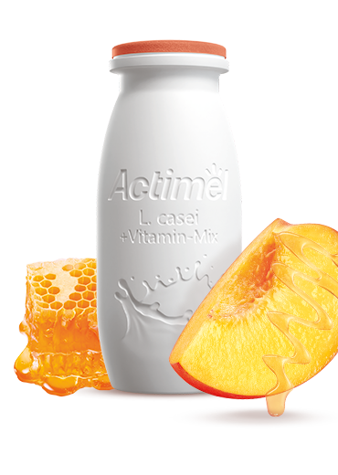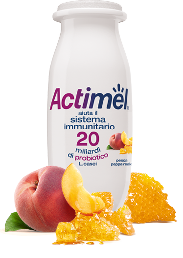Bevanda a base di latte fermentato con Lactobacillus casei, Streptococcus thermophilus e Lactobacillus bulgaricus, zucchero e preparazione di frutta arricchita con calcio e vitamine B6 e D. Latte scremato, crema di latte, zucchero liquido (saccarosio: 8,4%), purea di pesca 2,1%, destrosio, addensanti: amido modificato di tapioca, sali minerali del latte, pappa reale 0,1%, aromi naturali, correttori di acidità: acido citrico, probiotico: L.casei (Lactobacillus paracasei subsp. paracasei CNCM I-3689), S.thermophilus, L.bulgaricus; vitamine B6 e D3. Senza glutine. Senza conservanti e senza coloranti artificiali.