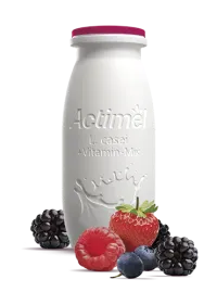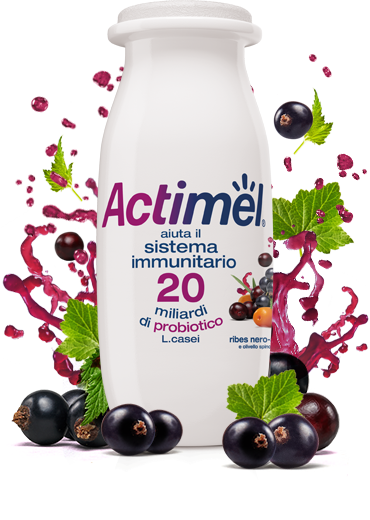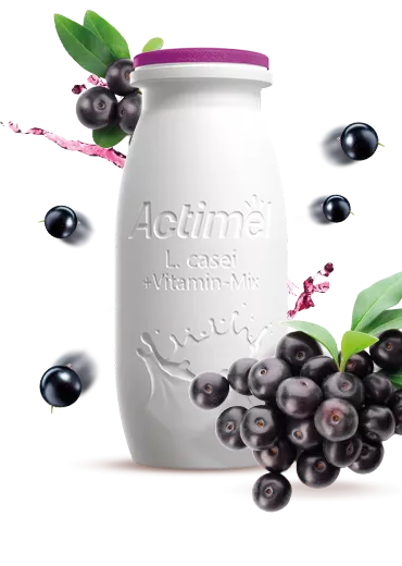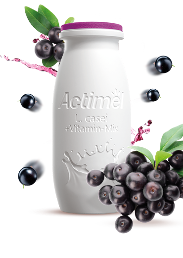 Bevanda a base di latte fermentato con Lactobacillus casei, Streptococcus thermophilus e Lactobacillus bulgaricus, zucchero e preparazione di frutta, arricchita con calcio e vitamine B6 e D. Latte scremato, zucchero liquido (saccarosio 6,9%), crema di latte, purea di ribes nero 1,5%, purea di mirtilli neri 1,0%, purea di olivello spinoso 0,75%, destrosio, succo concentrato di Açai 0,5%, stabilizzante: amido modificato di mais; sali minerali del latte, correttori di acidità: citrato di sodio, aromi, concentrato di succo d’uva; L.casei, S.thermophilus, L.bulgaricus, vitamine D3 e B6. Senza conservanti e senza coloranti artificiali. Senza glutine