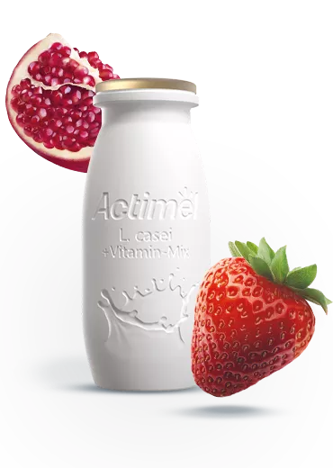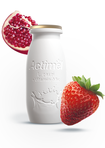 Bevanda a base di latte fermentato zuccherato e preparazione di frutta arricchita con calcio, magnesio e vitamine D, C e B6. Latte scremato, latte scremato ricostituito, zucchero 7%, crema di latte, oligofruttosio, purea di fragola 1,5%, succo di melograno da concentrato 0,5%, stabilizzanti: pectina, amido modificato; destrosio, sali di magnesio dell'acido citrico; minerali del latte, aromi, correttori di acidità: acido citrico, citrato di sodio; probiotico: L.casei (Lactobacillus paracasei subsp. paracasei CNCM I-3689); fermenti lattici: S.thermophilus, L.bulgaricus; vitamine B6, C e D3. Senza glutine.