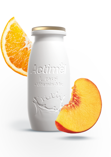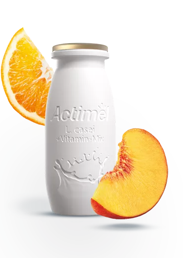 Bevanda a base di latte fermentato zuccherato e preparazione di frutta arricchita con calcio, magnesio e vitamine B6, C e D. Latte scremato, latte scremato ricostituito, zucchero 7%, crema di latte, oligofruttosio, purea di pesca da concentrato 0,62%, succo di limone da concentrato 0,6%, purea di arancia 0,6%, purea di fragola 0,5%, purea di pesca albicocca da concentrato 0,2%, destrosio, stabilizzante: amido modificato; sali di magnesio dell'acido citrico; sali minerali del latte, aromi, correttori di acidità: acido citrico, citrato di sodio; probiotico: L.casei (Lactobacillus paracasei subsp. paracasei CNCM I-3689); fermenti lattici: S.thermophilus, L.bulgaricus; vitamine B6, C e D3. Senza glutine.