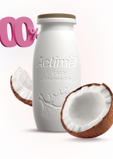 Bevanda a base di latte scremato fermentato con Lactobacillus casei, Streptococcus thermophilus e Lactobacillus bulgaricus, e preparato di cocco, edulcoranti ed arricchito con calcio e vitamine B6 e D. Latte scremato, latte scremato ricostituito, acqua, latte di cocco 1%, amido modificato, addensante: pectina; sali minerali del latte, aroma naturale, correttori di acidità: citrato di sodio, acido citrico; aromi, edulcoranti: sucralosio, acesulfame K; probiotico: L.casei Danone; fermenti lattici: S.thermophilus, L.bulgaricus; vitamine B6 e D3. Senza conservanti e senza coloranti artificiali.